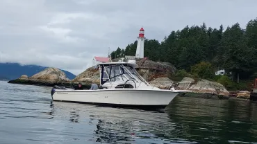 This boat is 30 feet in length and is the largest charter boat in the Vancouver Charter scene. It is our most popular boat for bigger groups and for those smaller groups who want lots of room. The boat has twin 250hp engines, and 15 hp trolling and top of the line fish finding equipment including autopilot. The heated cabin has a good sized private washroom with a flush toilet. Our Grady White Marlin can take up to 6 people comfortably. In some cases, like family groups we can accommodate 7 people on this boat, please call or email to inquire about 7 person groups.
